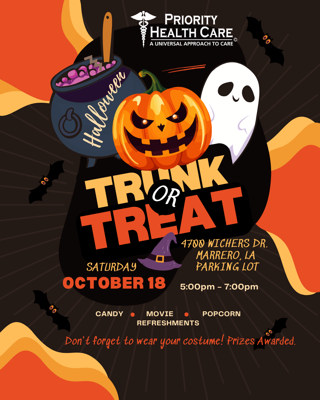 PHC is hosting a fun-filled safe Halloween event for children, staff and community residents on the parking lot of its Marrero Clinic, 4700 Wichers Drive. A family-friendly movie will be shown for children in attendance, prize for best decorated trunk, treats, food and drinks will be provided. Costumes are welcome. Click for flyer: Spanish, English